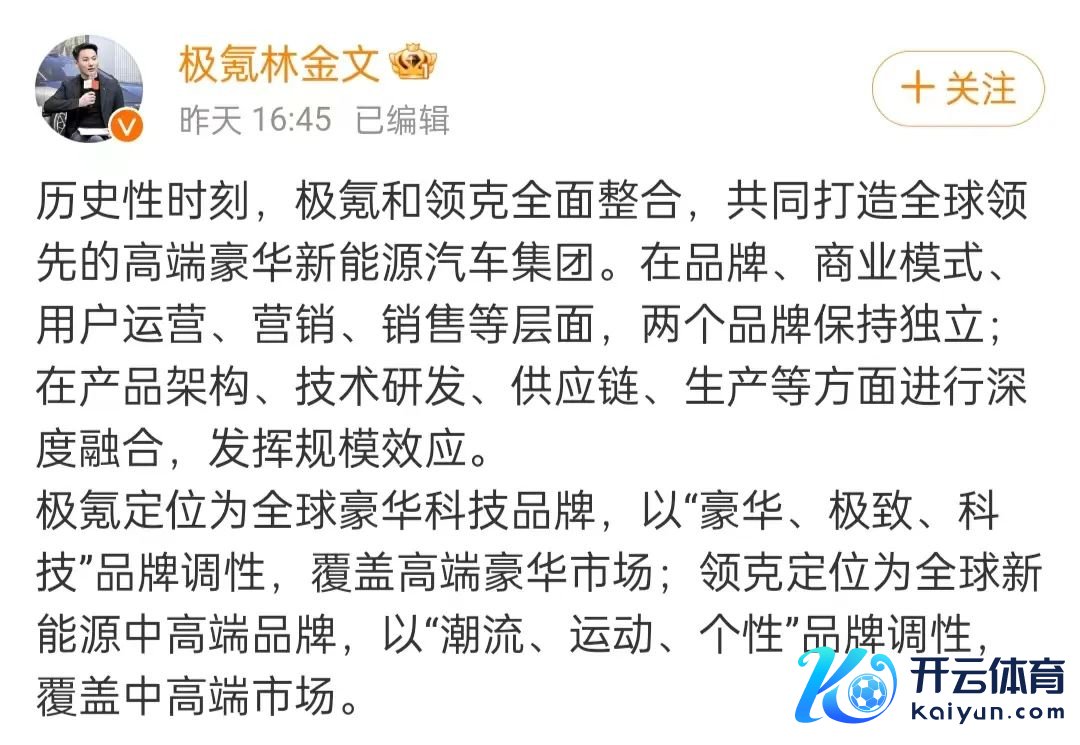 关于兼并,安详给出的情理是,减少关联来回、排斥同行竞争,矍铄不移推动里面资源深度整合和高效会通。极氪智能科技副总裁林金文发文称,这是“历史性时间”。