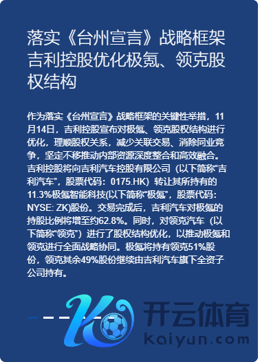 开云体育(中国)官方网站 安详旗下两大品牌极氪与领克弘扬官宣兼并。 11月14日,安详控股集团晓谕,动作落实《台州宣言》政策框架的要津性举措,对极氪、领克股权结构进行优化。安详控股集团将向安详汽车控股有限公司(以下简称“安详汽车”)转让其所执有的11.3%极氪股份。来回完成后,安详汽车对极氪的执股比例将增至约62.8%。 更受商场时势的是极氪和领克的整合。通过一系列股权来回,极氪将执有领克51%股份,领克其余49%股份连续由安详汽车旗下全资子公司执有。按照出售价钱,领克全体估值约为180亿东谈
