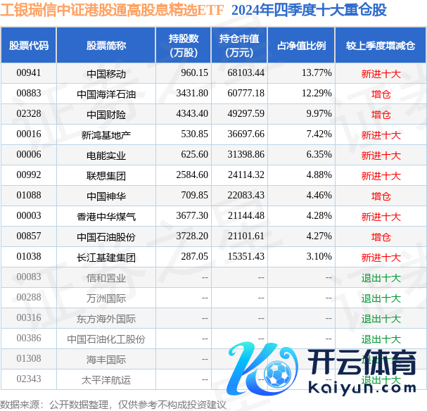 工银瑞信中证港股通高股息精选ETF为指数型-股票基金,阐发最新一期基金季报走漏,该基金财富设置:股票占净值比94.19%,无债券类财富,现款占净值比23.87%。基金十大重仓股如下: